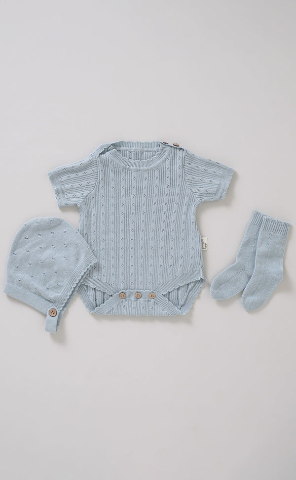 Avibae Luxary Cotton Patterned Openwork Romper 3-Piece Buddle Nestle Sky