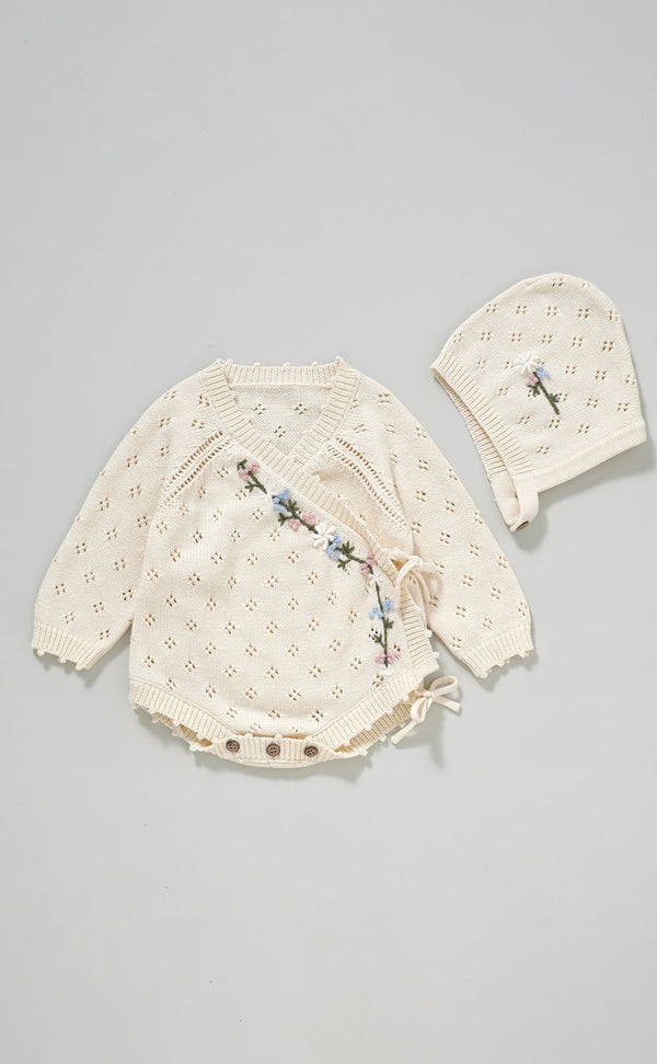 Hand Embroidery Flower Cotton Romper 2-Piece Creamy White