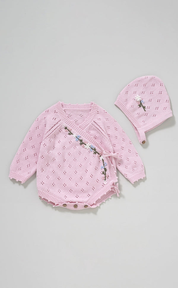 Hand Embroidery Flower Cotton Romper 2-Piece Pink